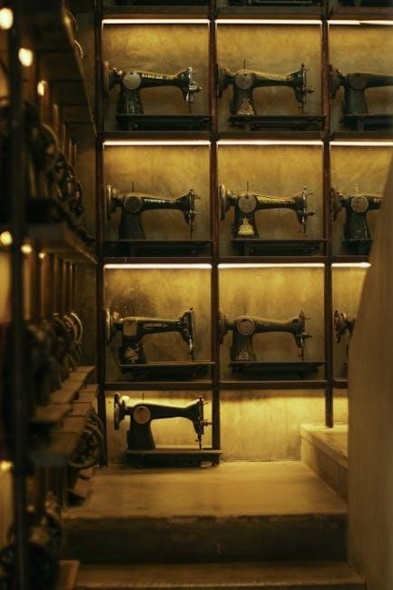 The needle clamp securely holds the needle‚ and the presser foot applies even pressure to the fabric. The feed dogs advance the material‚ and the bobbin case houses the lower thread. The tension discs regulate thread flow‚ ensuring balanced stitches. Understanding each component’s role is vital for efficient operation and achieving professional results. Familiarize yourself with these parts to unlock the machine’s full potential and troubleshoot any issues effectively.